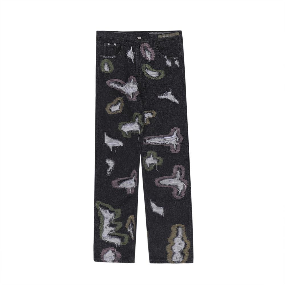 Color Contrast Ripped Embroidered Jeans American Style